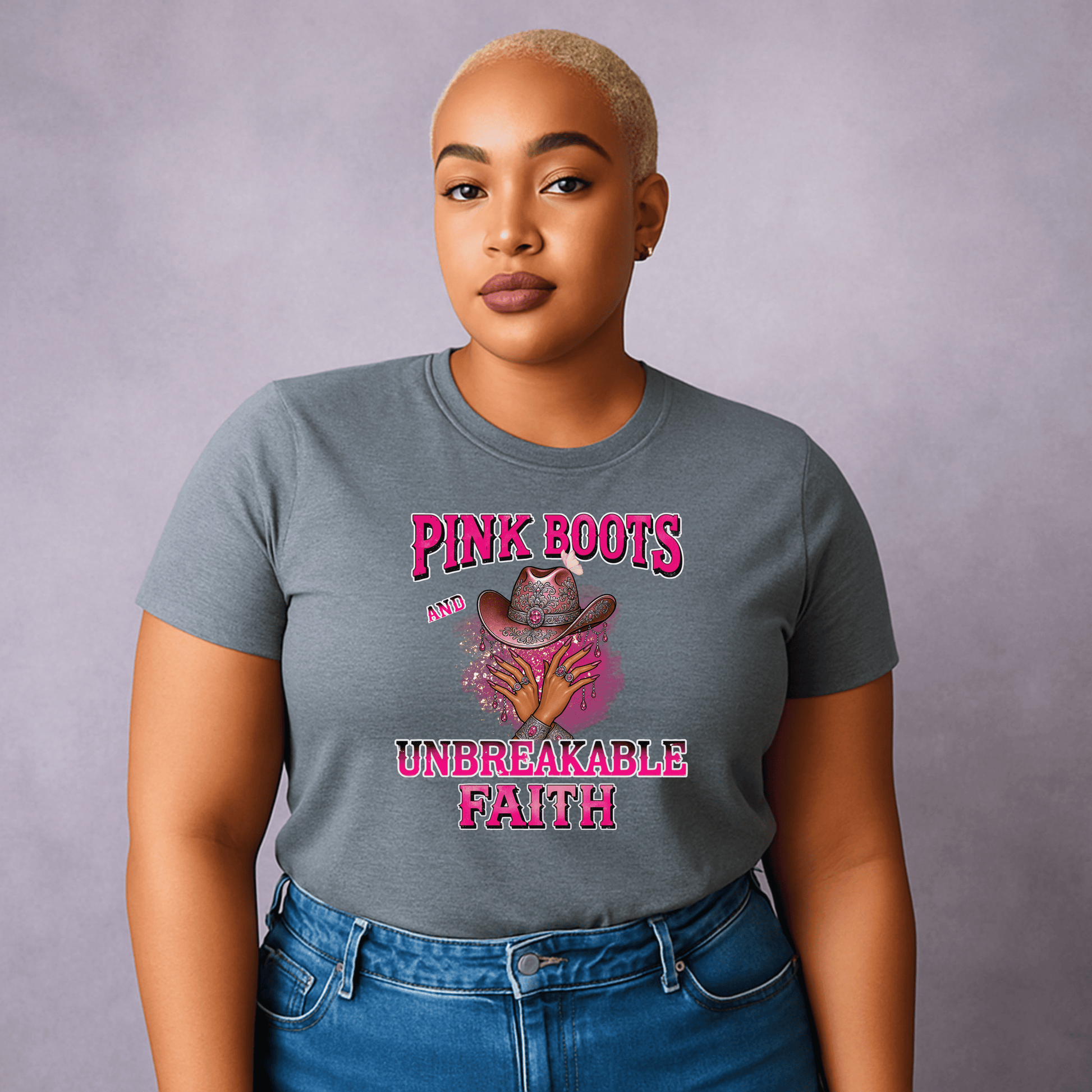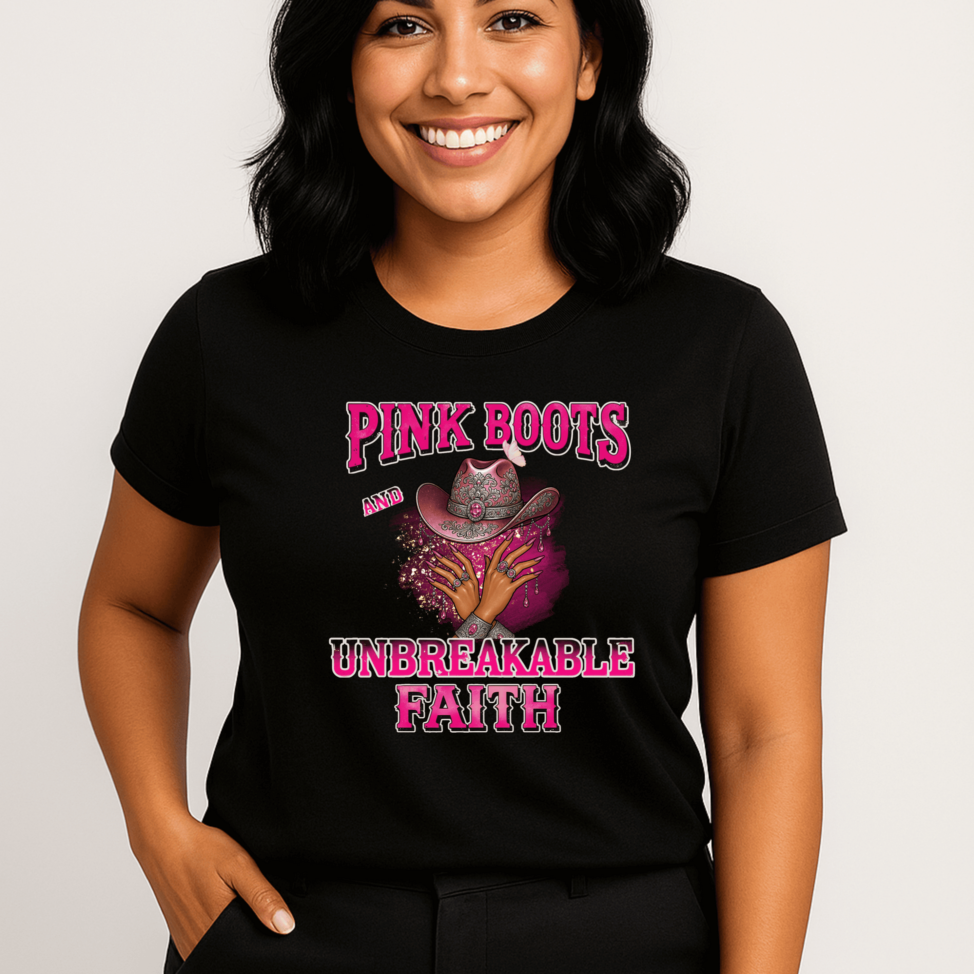 Step out in bold style with our Pink Boots and Unbreakable Faith shirt! πβ¨ This Western cowgirl graphic tee is perfect for rodeo lovers, country girls, and women of faith who embrace strength, resilience, and style. Featuring a sparkling pink cowgirl hat, jeweled details, and empowering text, this shirt makes a great gift for Christian women, breast cancer awareness, country concerts, or anyone who walks in unshakable faith. Pair it with boots and jeans for the ultimate country-chic look!